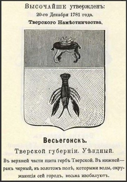 Блазонирование герба города Весьегонска звучит так: "В золотом поле рак черный, которыми воды, окружающие сей город, весьма изобилуют".