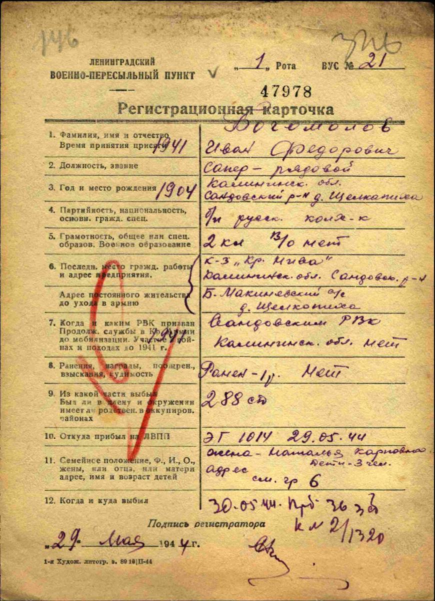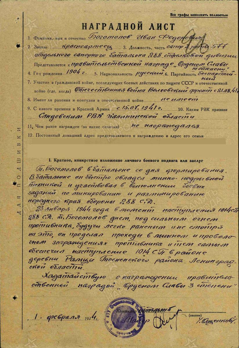 Краткое, конкретное изложение личного боевого подвига или заслуг: «Товарищ Богомолов в батальоне со дня формирования. В батальоне он быстро овладел минно-подрывной техникой и участвовал в выполнении боевых заданий по минированию и разминированию переднего края обороны 288 СД.