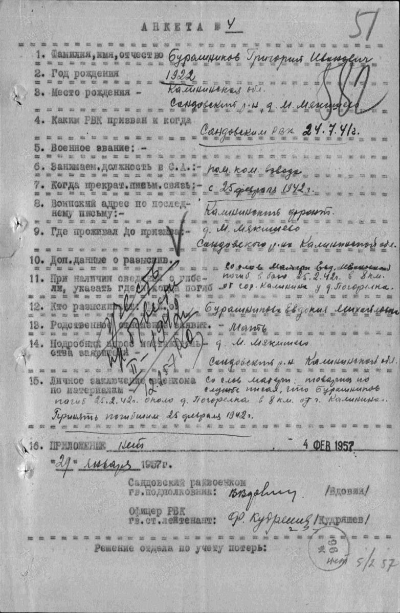 Со слов матери, Евдокии Михайловны: товарищ по службе писал, что Бурашников погиб в бою 25.02.1942 года в 8 километрах от города Калинина, у деревни Погорелка.