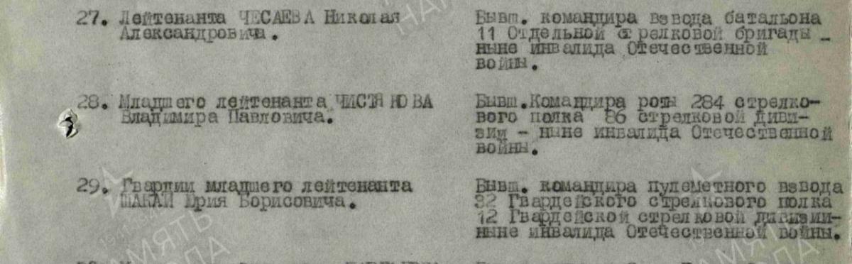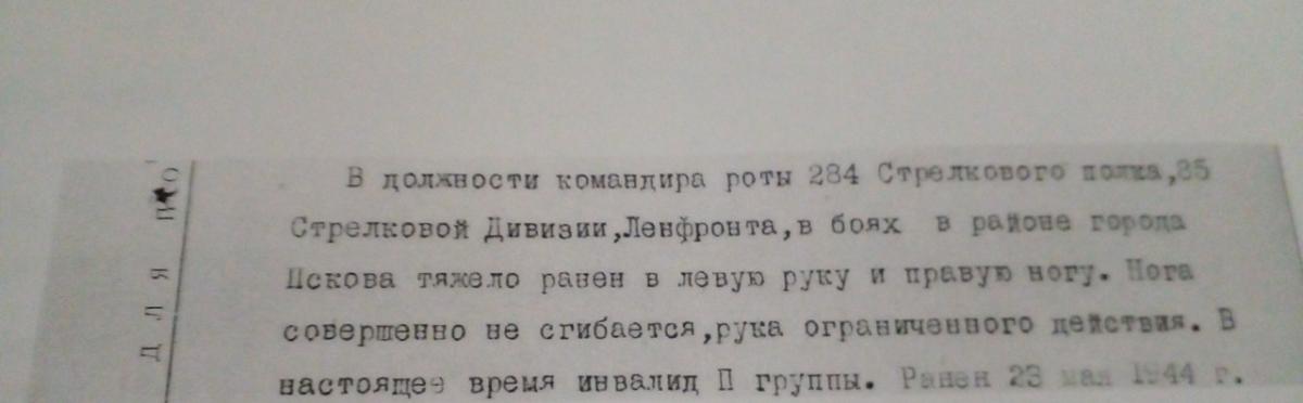 «В должности командира роты 284 Стрелкового полка, 85(86) Стрелковой Дивизии «Ленфронта» в боях в районе города Пскова тяжело ранен в левую руку и правую ногу. Нога совершенно не сгибается, рука ограниченного действия. В настоящее время инвалид IIгруппы. Ранен 23 мая 1944 г.». Конкретный подвиг не указан. Очевидно, после ранения продолжил командование. Впрочем, эти строки из документа указаны больше для поставления военнослужащего на учёт по инвалидности, нежели для поощрения.