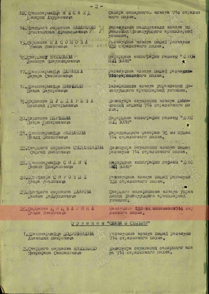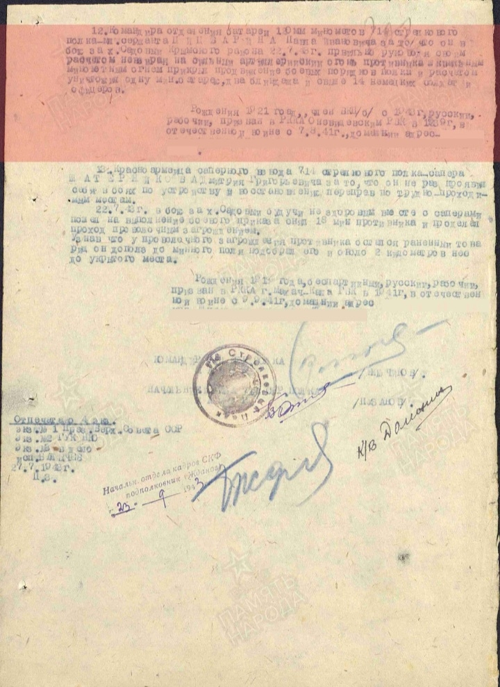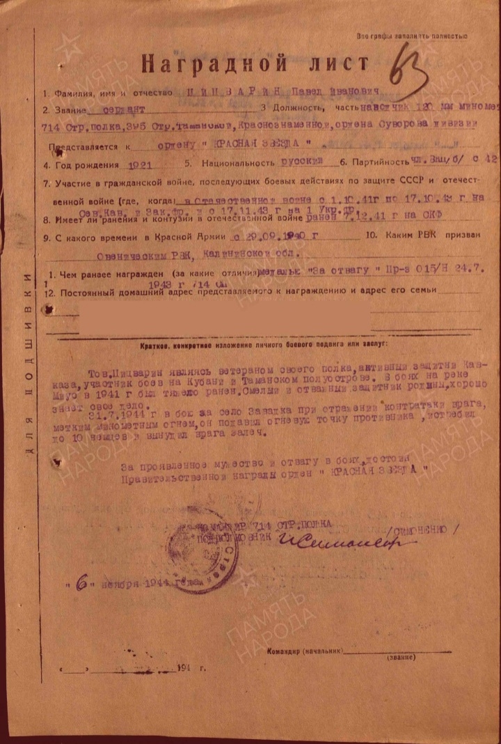 Воинская часть: 714 стрелковый полк 395 стрелковой дивизии Дата документа: 24.06.1943 Дата поступления на военную службу: 1939 г. Воинское звание: мл. сержант Награжден: 714 сп 395 сд Северо-Кавказского фронта.