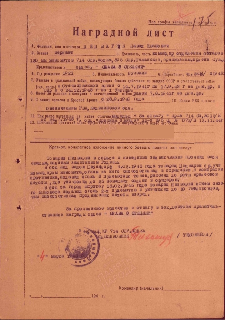 Воинская часть: 714 стрелковый полк 395 стрелковой дивизии Дата документа: 07.03.1945 г. Дата поступления на службу: 23.09.1940 Воинское звание: сержант - командир отделения батареи 120 мм минометов 714 сп. Награжден: 395 сд 1 Украинского фронта.