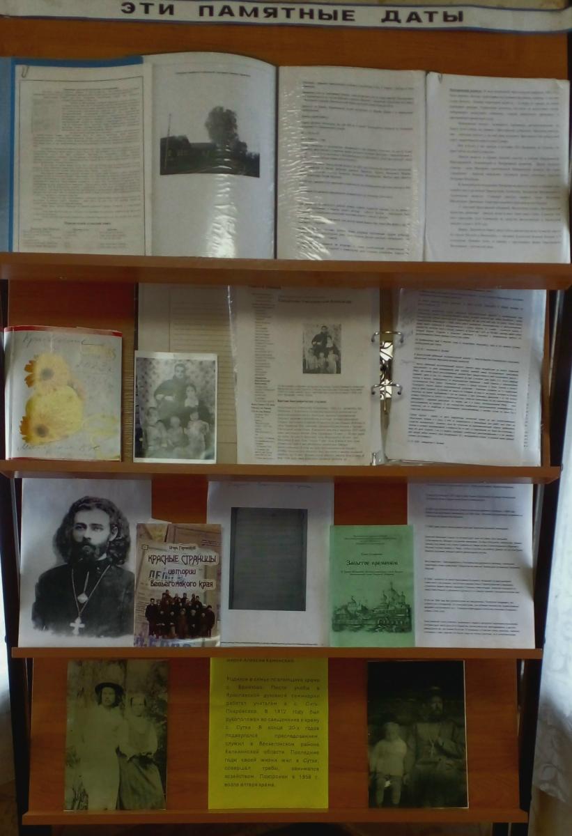 30 октября – День памяти жертв политических репрессий. В библиотеке в этот день была оформлена выставка-память «Эти памятные даты: Жертвы политических репрессий нашей сторонушки». У выставки состоялся краеведческий разговор с читателями, в ходе которого библиотекарь рассказал о личностях нашего села и округа, подвергшихся преследованиям за свои политические и религиозные убеждения. Некоторые люди – жители села – попали в жернова политических репрессий по доносу завистников и по произволу местных властей, выполнявших и перевыполнявших план по раскулачиванию. Кто-то угодил в лагеря также в войну и послевоенные голодные годы за то, что пытался унести с поля колосья и зёрна, чтобы спасти от голодной смерти близких. В ходе разговора вспомнили: священников Иоанна и Петра Знаменских из нашего села, Николая Беляева из Николо-Высоки, Иоанна Пономарёва из Чамерова, Алексия Каменского (тоже священника в Чистой Дуброве), Алексия Никольского – последнего Суковского батюшки, который причислен к лику святых Русской Православной Церкви; Александра Николаевского – последнего служащего священника с Камня, репрессированных сестёр Троице-Пятницкого женского монастыря, чью судьбу (как и судьбы многих других пострадавших в 1920-30-е гг. в нашем округе) смогла выяснить благодаря архивным данным наш покойный краевед Е.И. Селифонова, проделавшая в этом отношении титаническую работу. Вспомнили мы и многих других наших невинно репрессированных земляков. Информация о некоторых из них имеется в архиве нашей библиотеки и была также представлена на выставке. С данной информацией можно познакомиться при посещении библиотеки.