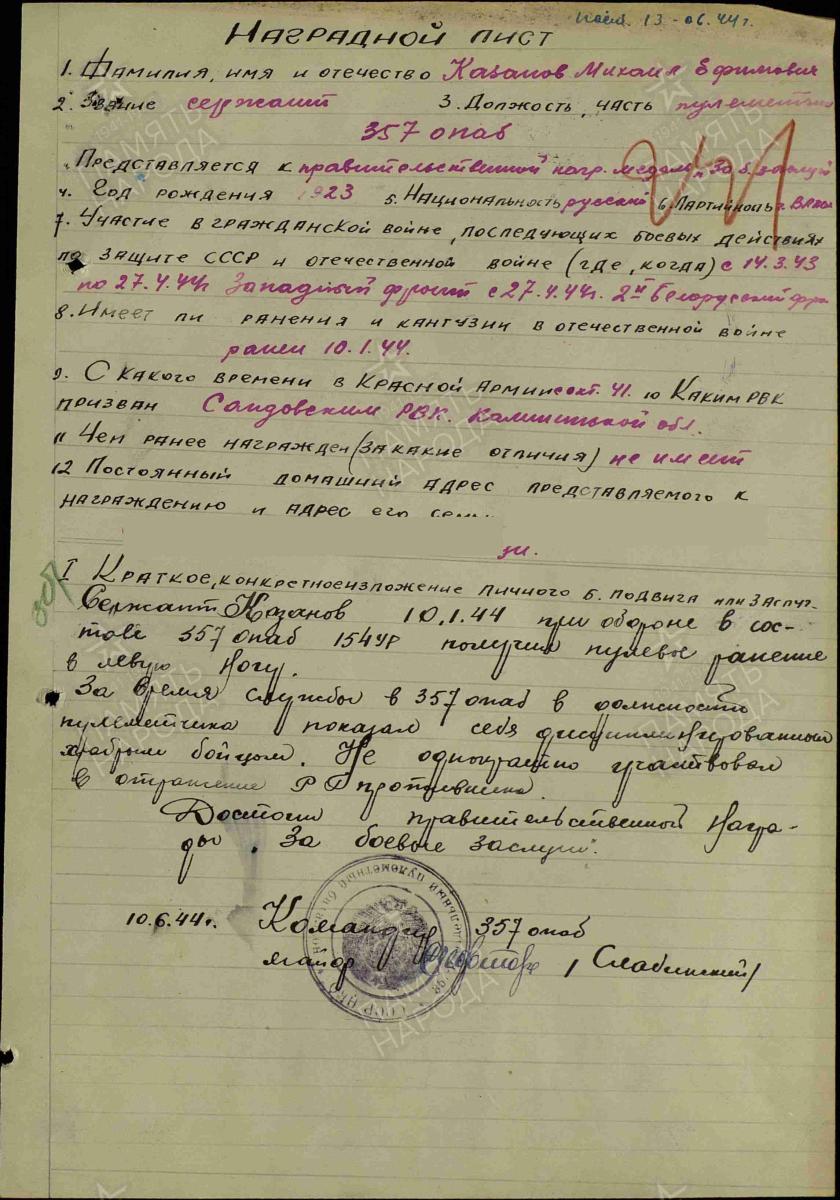 Краткое, конкретное изложение личного боевого подвига или заслуг: «Сержант Казанов 10.01.1944 года при обороне в составе 357-го опаб 154-го УРполучил пулевое ранение в левую ногу.