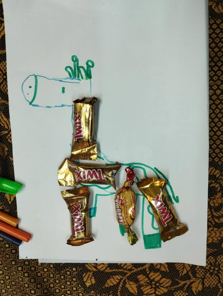 Не меньший интерес вызвало и задание «Мастерская идей». На обёртках от конфет были напечатаны задания. Например: создай из конфет ожерелье, изготовь праздничное панно, составь из разных конфет оригинальный орнамент, сделай праздничный флажок и другие. И с этой творческой задачей ребята тоже успешно справились.