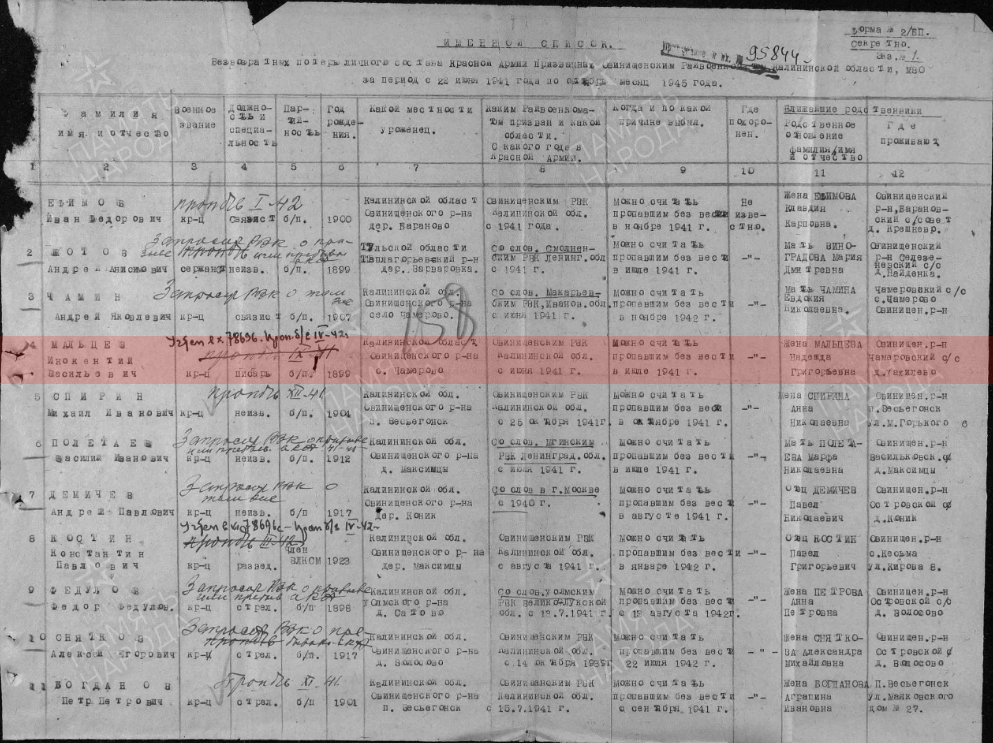 Иннокентий Васильевич призван на фронт 15 июля 1941 г. Овинищенским военкоматом.Воинское звание: рядовой красноармеец. Пропал без вести в апреле 1942 г.