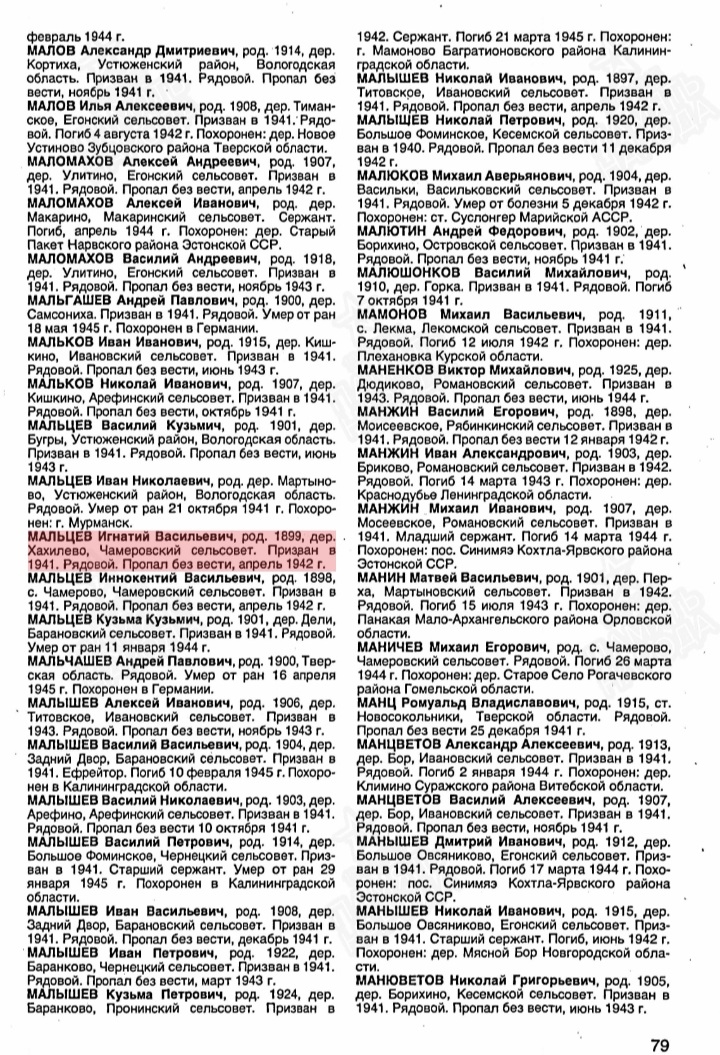 Родной брат Иннокентия – Игнатий Васильевич Мальцев. Родился в 1899 г. в д. Хахилево. Призван на фронт в качестве рядового красноармейца летом 1941 г. Пропал без вести в апреле 1942 г.