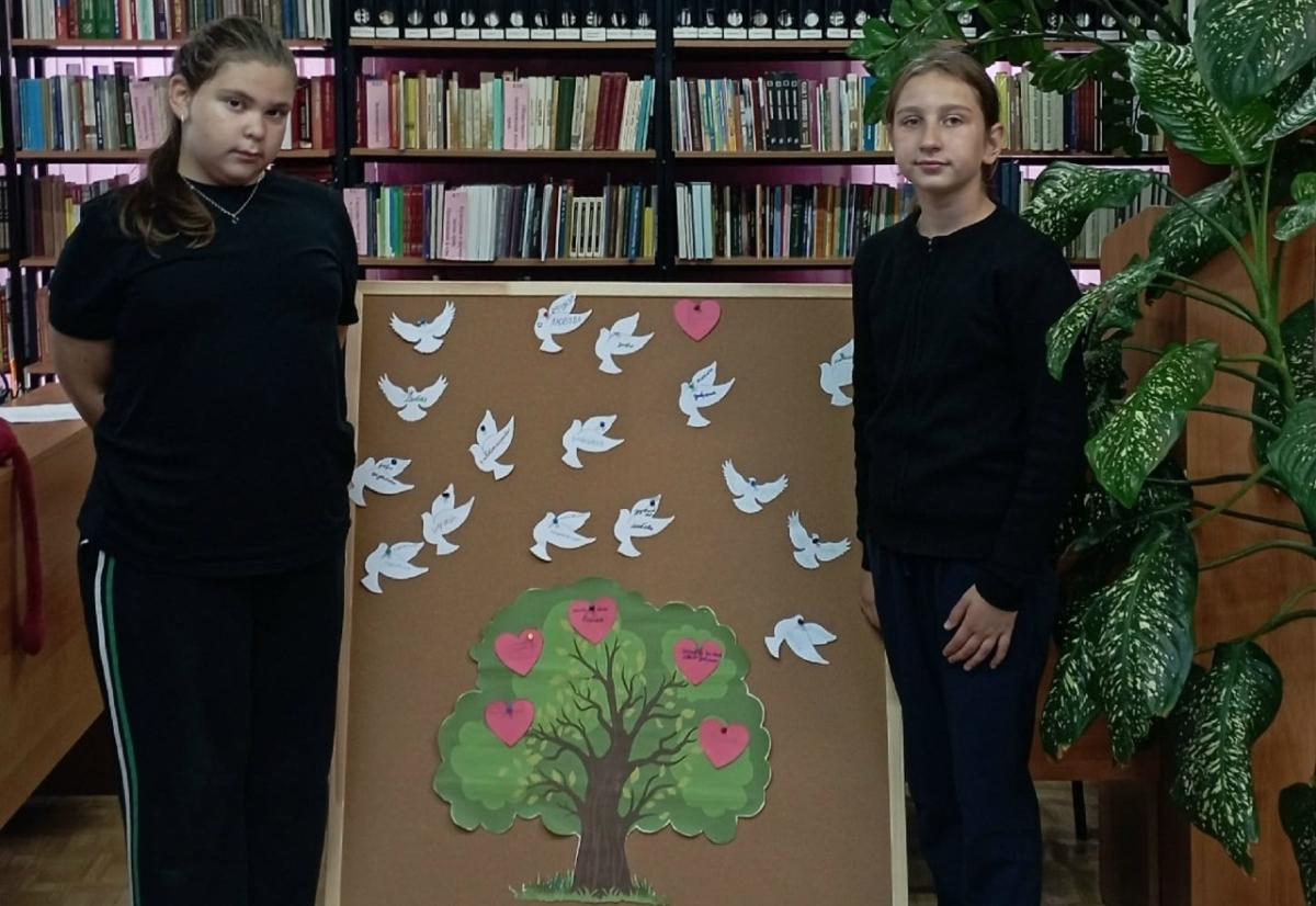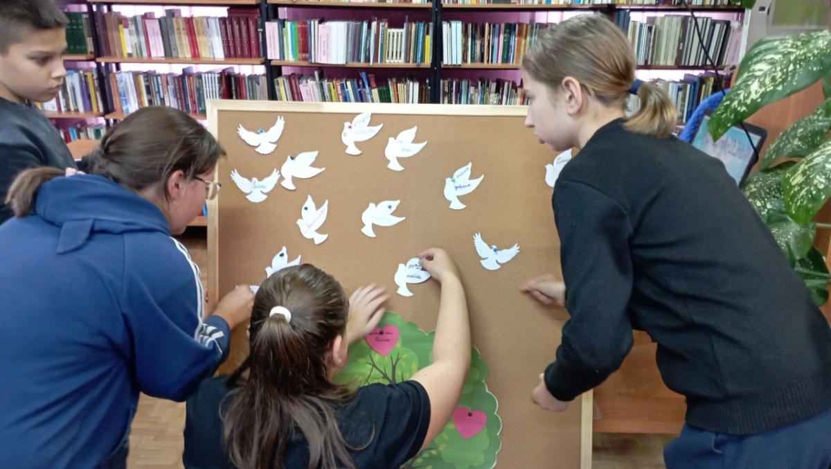 В преддверии Международного дня мира в читальном зале центральной библиотеки прошел информационно-творческий час «Голубь мира: история и традиции». Ребятам 5 В класса Весьегонской СОШ рассказали историю праздника, познакомили с его традициями. Они находили противоположности злу с помощью добра. Ребята сами составили человечеству «дерево мира» с пожеланиями на сердечках, а на крыльях голубков, которые являются символом праздника, написали необходимые качества для достижения мирного сосуществования людей на всей планете.