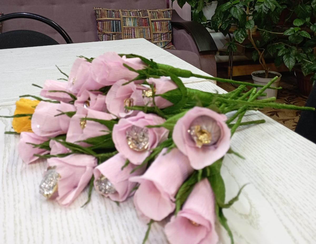К Дню матери девочки из кружка «Маршрут краеведа» подготовили особенный сюрприз! Они своими руками сделали красивые розы из гофрированной бумаги, а внутри каждой спрятали вкусную конфетку. В сам праздник эти милые розочки были вручены мамам и бабушкам, которые приводили ребят на занятия в Дом детского творчества. А затем девушки продолжили свою праздничную миссию, устроив уличную поздравительную акцию.