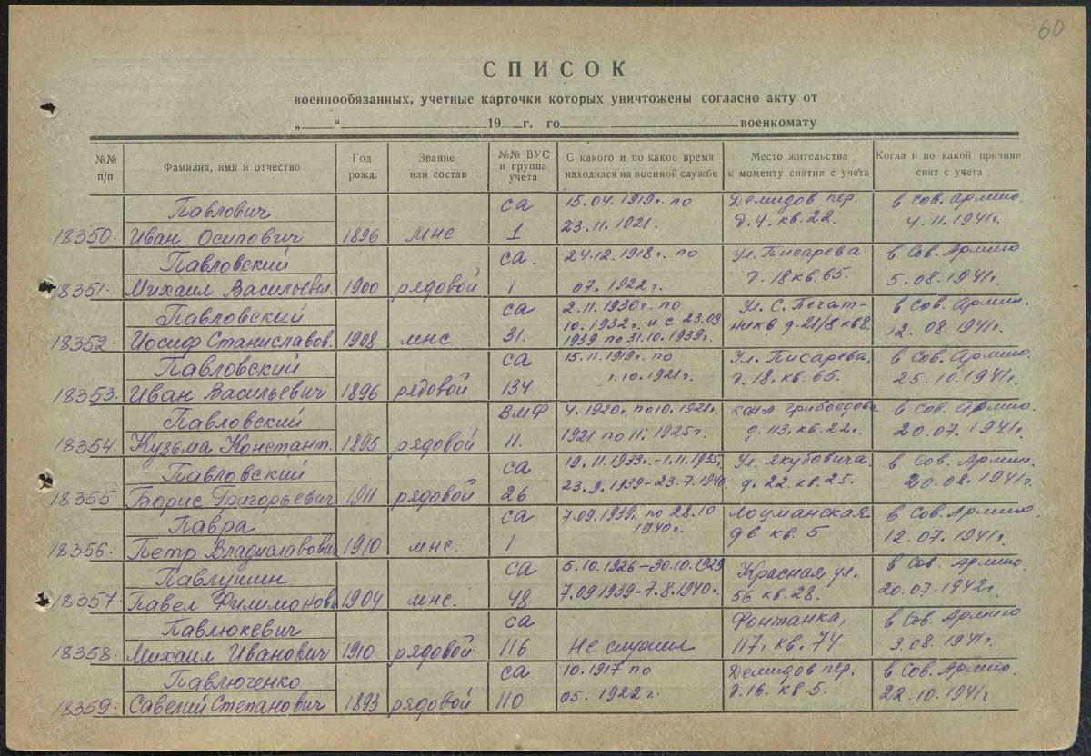 Призван: Октябрьским РВК (Калининская обл., Октябрьский р-н). Повторно призывался Октябрьским РВК (Ленинградская обл., г. Ленинград, Октябрьский р-н).