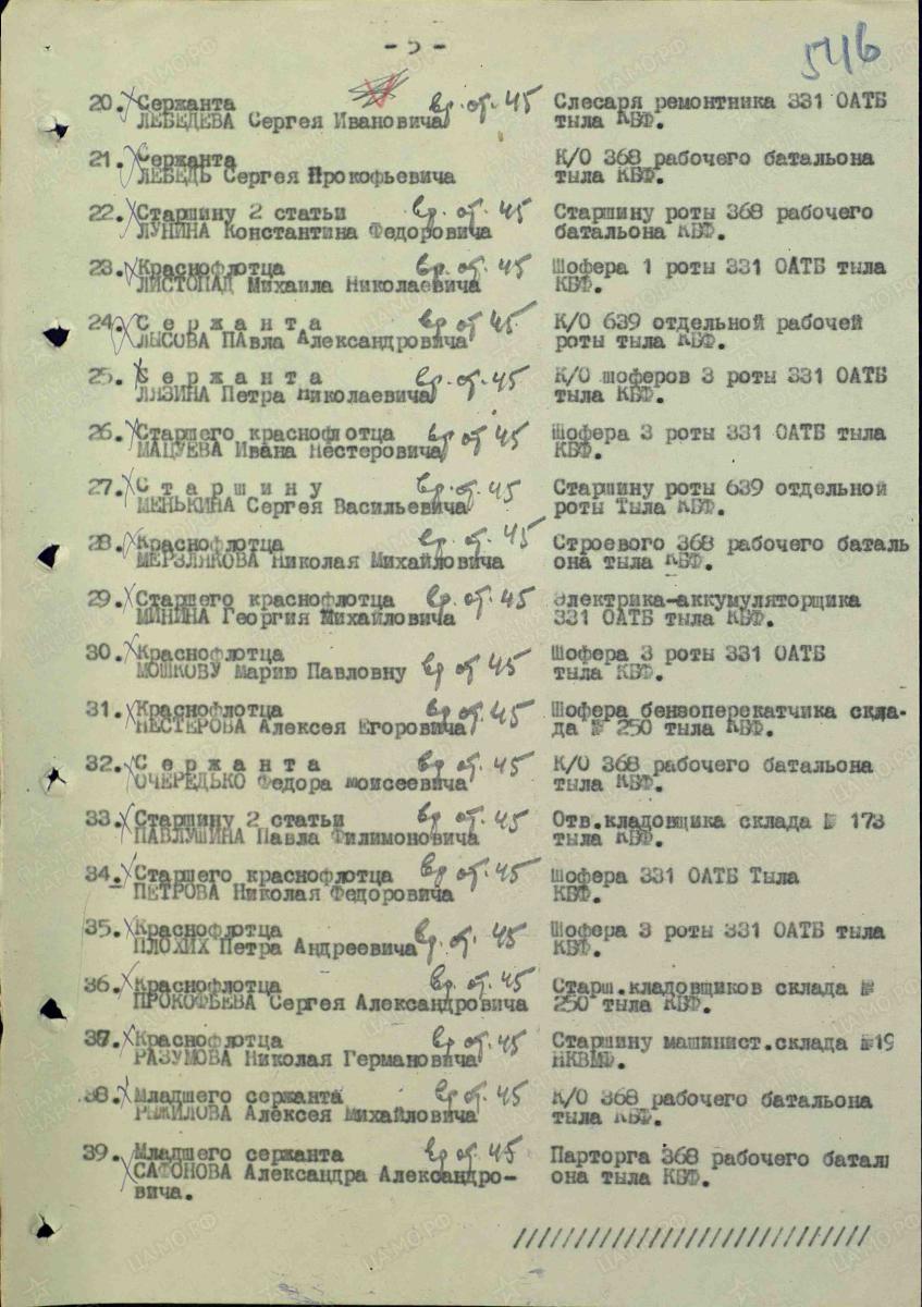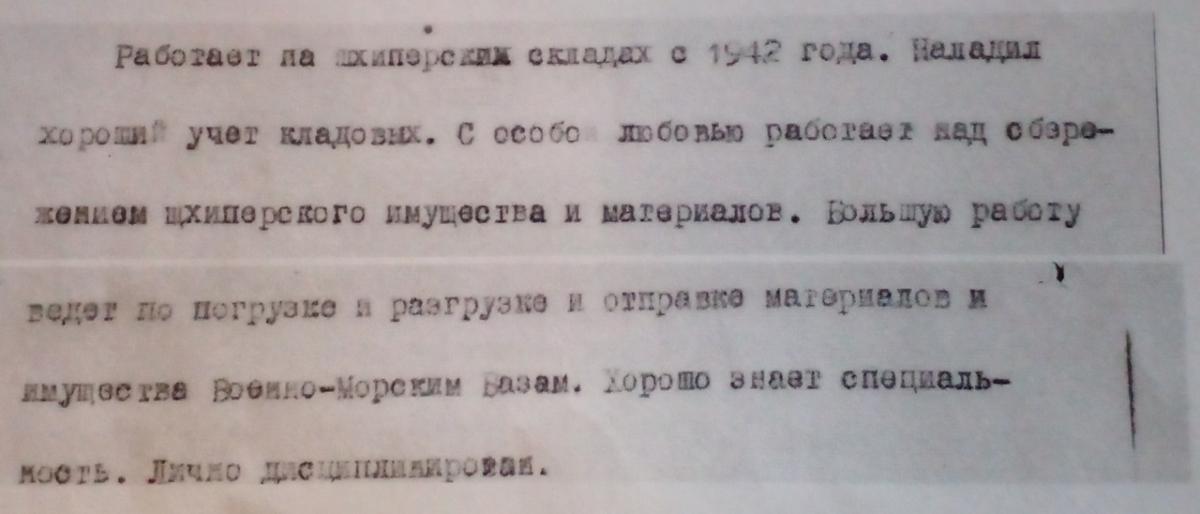 «Работает на шхиперских складах с 1942 г. Наладил хороший учёт кладовых. С особой любовью работает над сбережением шхиперского имущества и материалов. Большую работу ведет по погрузке и разгрузке и отправке материалов и имущества Военно-Морским Базам. Хорошо знает специальность. Лично дисциплинирован» (из Наградного листа).