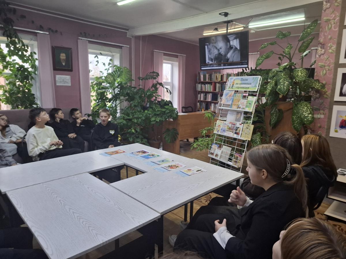 Затем библиотекарь представила книжную выставку «Папы на книжных страницах», на которой были представлены книги, где одним из главных героев является папа. А в заключении ребята просмотрели трогательный отрывок из фильма "Судьба человека".