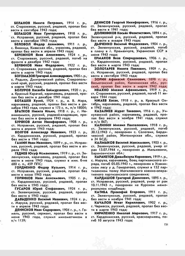 Книга памяти. Карачаево-Черкесская Республика: «… ЗОРИН Афанасий Семенович, 1898 г.р., Весьегонский район, Калининская область, русский, пропал без вести в марте 1942 года».