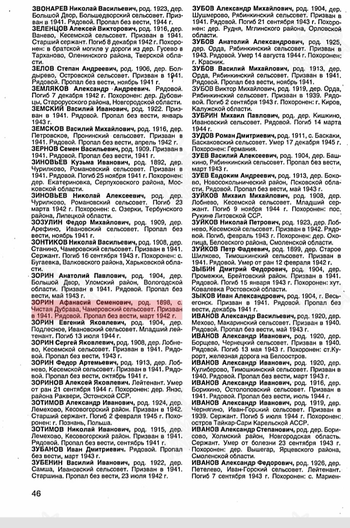 Книга памяти Тверской области (Весьегонский район): «… ЗОРИН Афанасий Семенович. Род. 1898, с. Чистая Дубрава, Чамеровский сельсовет. Призван в 1941. Рядовой. Пропал без вести, март 1942».