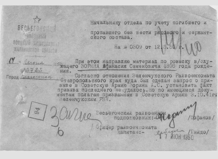 2 июня 1950 года Весьегонскому Райвоенкому: «… На Ваш запрос о высылке справки о призыве в Советскую Армию гражданина ЗОРИНА Афанасия Семеновича 1898 года рождения, сообщаю, что Зеленчукский Райвоенкомат требуемую Вами справку выслать не представляется возможным в связи с оккупацией немецко-фашистскими войсками, архивных материалов не сохранилось» (Зеленчукский райвоенком подполковник Доврар, делопроизводитель РВК Сорокин).