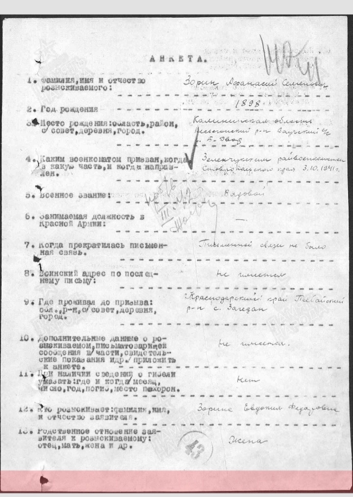 14 июня 1950 г. Начальнику отдела по учёту погибшего и пропавшего без вести рядового и сержантского состава: «При этом направляю материал по розыску в/служащего ЗОРИНА Афанасия Семеновича 1898 года рождения.